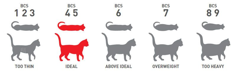 - Ideal – either 4 or 5: the cat or dog will likely have an obvious waist; slight abdominal tuck; ribs that can be easily felt with a gentle touch; and a small amount of abdominal fat