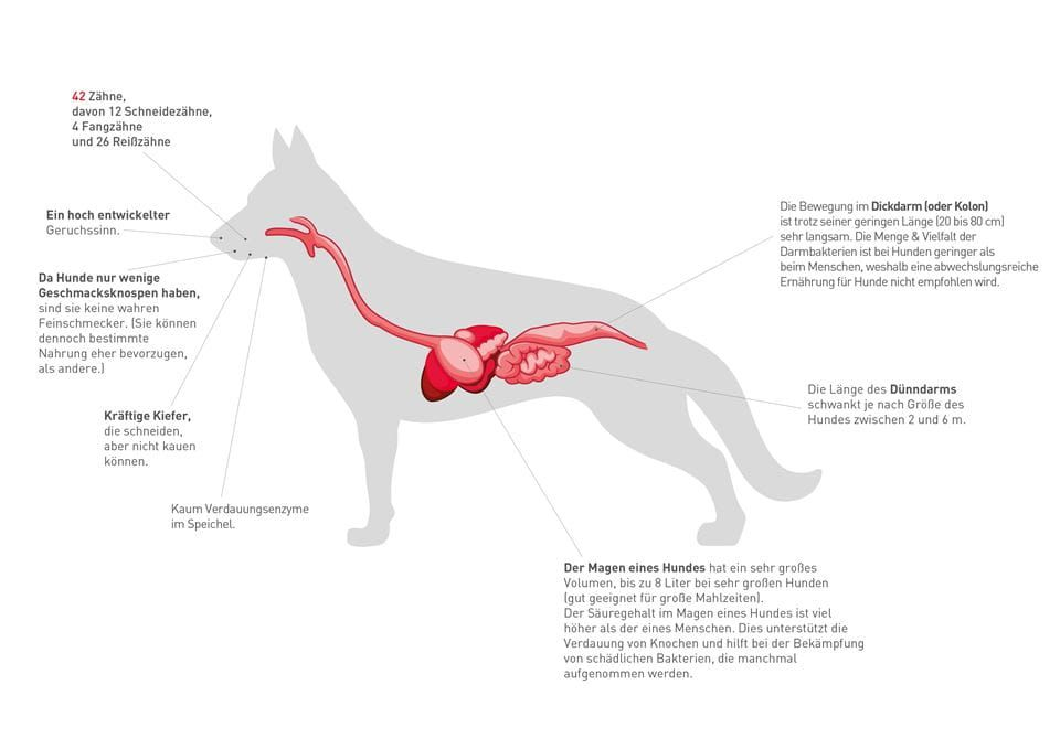 Bei Hunden beginnt die Verdauung im Magen. Direkt nachdem das Tier die Nahrung heruntergeschluckt und diese die Speiseröhre passiert hat, werden im Magen Verdauungsenzyme freigesetzt. Der Dünndarm ist zwar ein eher kleines Organ, bietet aber eine große Oberfläche, mit deren Hilfe die Nährstoffe vom Körper aufgenommen werden. Im letzten Schritt der Verdauung sorgt der Dickdarm dafür, dass die Abfallstoffe wieder aus dem Körper hinausbefördert werden.