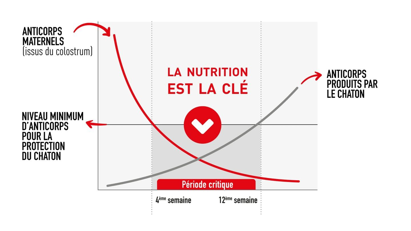 Le système immunitaire d’un chat adulte est beaucoup plus fort que celui d’un chaton, c’est pourquoi ce dernier a parfois besoin d’un soutien particulier. Votre chaton tire sa première immunité du colostrum de sa mère (le premier lait maternel) qui sert à transmettre une partie de la protection immunitaire de la mère à la portée juste après sa naissance. Ceci explique pourquoi il est essentiel qu’un chaton commence à téter correctement immédiatement après sa naissance, afin de recevoir suffisamment de colostrum et donc d’anticorps.