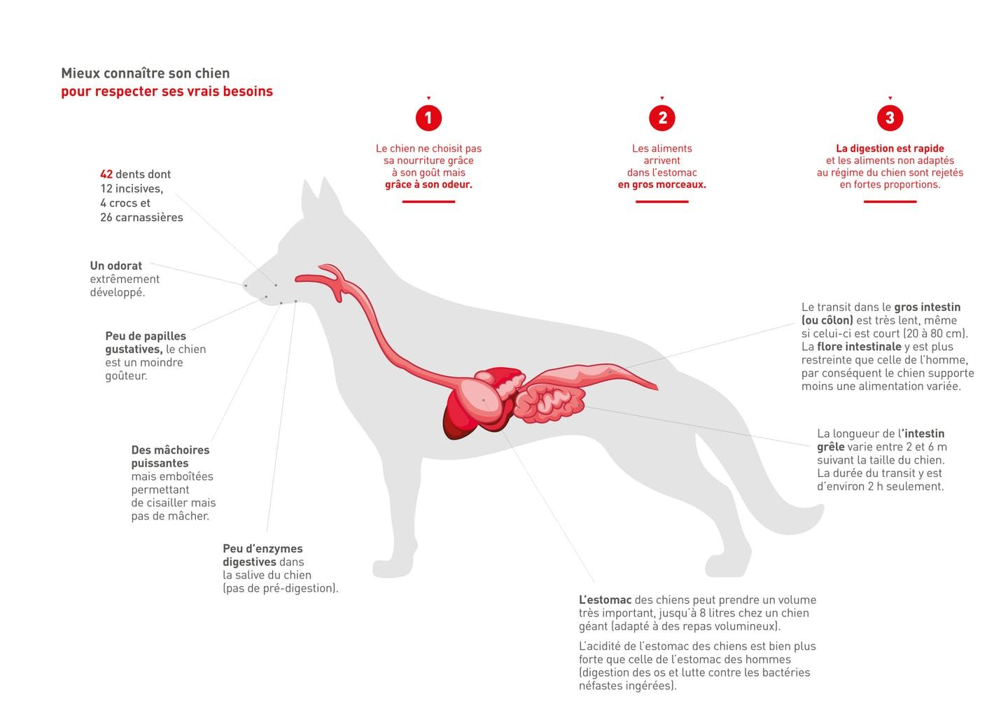 Chez le chien, la digestion commence dans l'estomac où sont libérées les enzymes digestives, peu présentes dans la salive, juste après que la nourriture ait été rapidement avalée. Chez l’homme, la digestion commence dans la bouche.