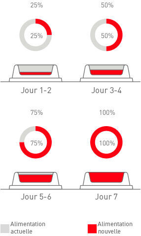 Jour 5 et 6 : 25 % de l’alimentation actuelle et 75 % de la nouvelle alimentation