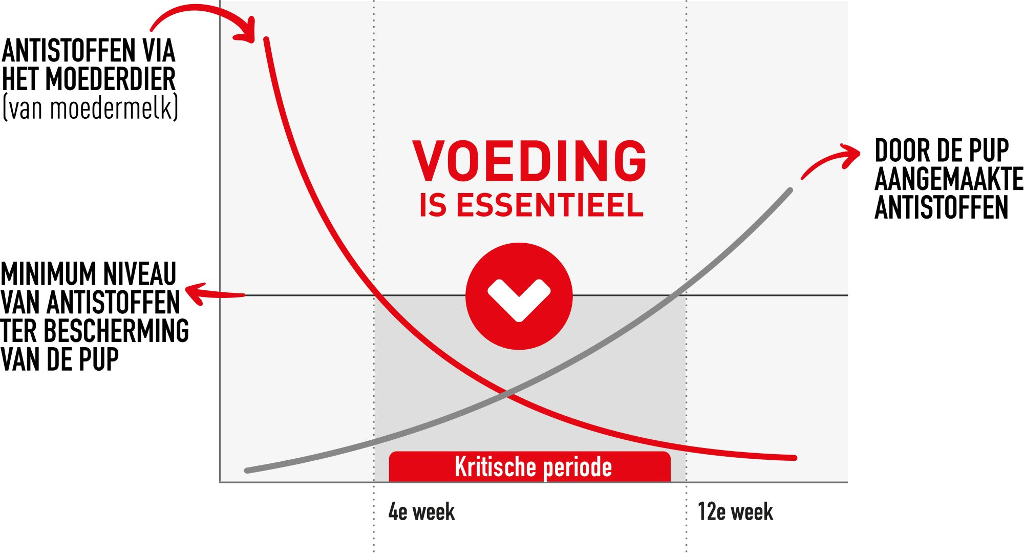 Je puppy bevindt zich in een kwetsbare fase als de antistoffen van moederhond flink zijn afgenomen en het eigen immuunsysteem nog niet sterk genoeg om deze bescherming volledig over te nemen. Dit noemen we het immuniteitsgat. Dit komt normaal gesproken voor in de leeftijd van 4 tot 12 weken. Gedurende deze periode kan het immuunsysteem van je puppy wel wat extra ondersteuning gebruiken. Dit doe je onder meer met behulp van vaccinaties én voeding.
