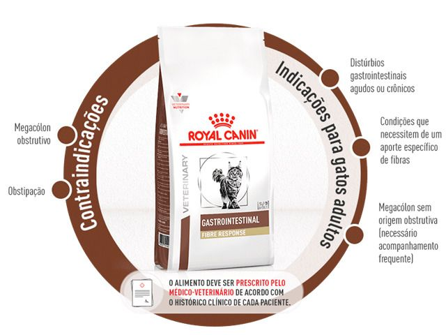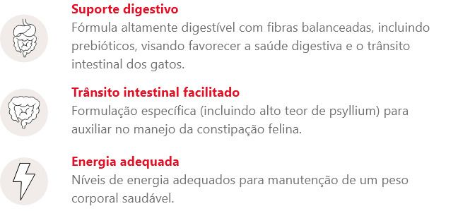 A dieta com elevado teor de Psyllium pode ajudar gatos com distúrbios digestivos pois o psyllium absorve grandes quantidades de água para formar um gel viscoso que facilita a propulsão do conteúdo fecal pelo intestino, estimulando o peristaltismo intestinal e umedecendo as fezes. Royal Canin® Fibre Response Feline apoia gatos com alterações intestinais que necessitem de aporte específico de fibras.