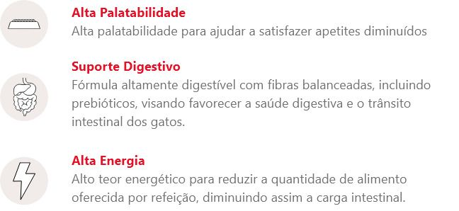 Alimento auxiliar no manejo de distúrbios agudos e crônicos de absorção intestinal e na recuperação do estado nutricional saudável em animais convalescentes. Ingredientes de alta digestibilidade e aproveitamento.
