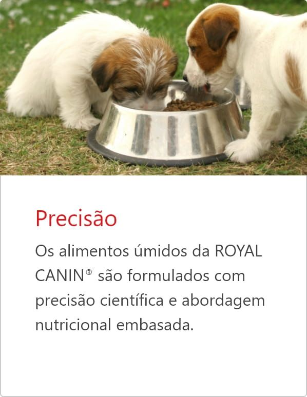 Os alimentos úmidos, além de fazerem a alegria dos pets - são muuuito apetitosos– também são importantes para a saúde. Completos, balanceados e de baixa caloria. Os alimentos úmidos ROYAL CANIN® não são considerados petiscos e devem fazer parte da rotina alimentar do seu cão.