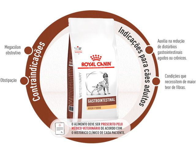 ROYAL CANIN® Gastrointestinal High Fibre é um alimento coadjuvante seco indicado para cães adultos, formulado com o objetivo de auxiliar na redução de distúrbios gastrintestinais agudos ou crônicos.
