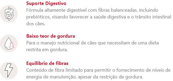 Um alimento seco formulado com o objetivo de auxiliar na redução de distúrbios agudos de absorção intestinal e na recuperação do estado nutricional saudável em animais convalescentes. Ingredientes de alta digestibilidade.