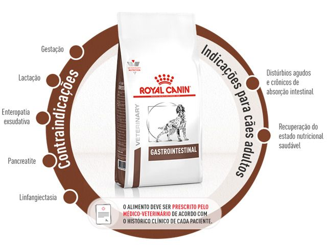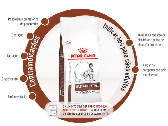 Gastrointestinal Moderate Calorie é um alimento coadjuvante seco indicado para cães adultos, formulado com o objetivo de auxiliar na redução de distúrbios agudos de absorção intestinal e como compensação pela má digestão.