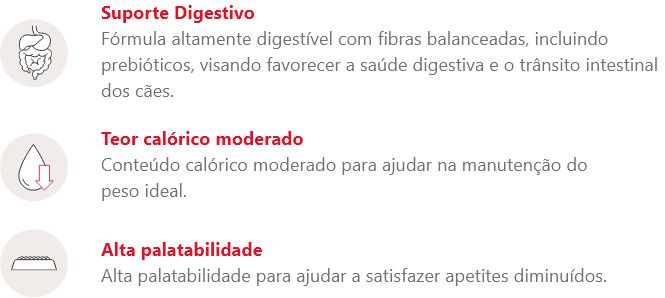Alimento auxiliar no manejo de distúrbios agudos e crônicos de absorção intestinal e na recuperação do estado nutricional saudável em animais convalescentes. Ingredientes de alta digestibilidade e aproveitamento.