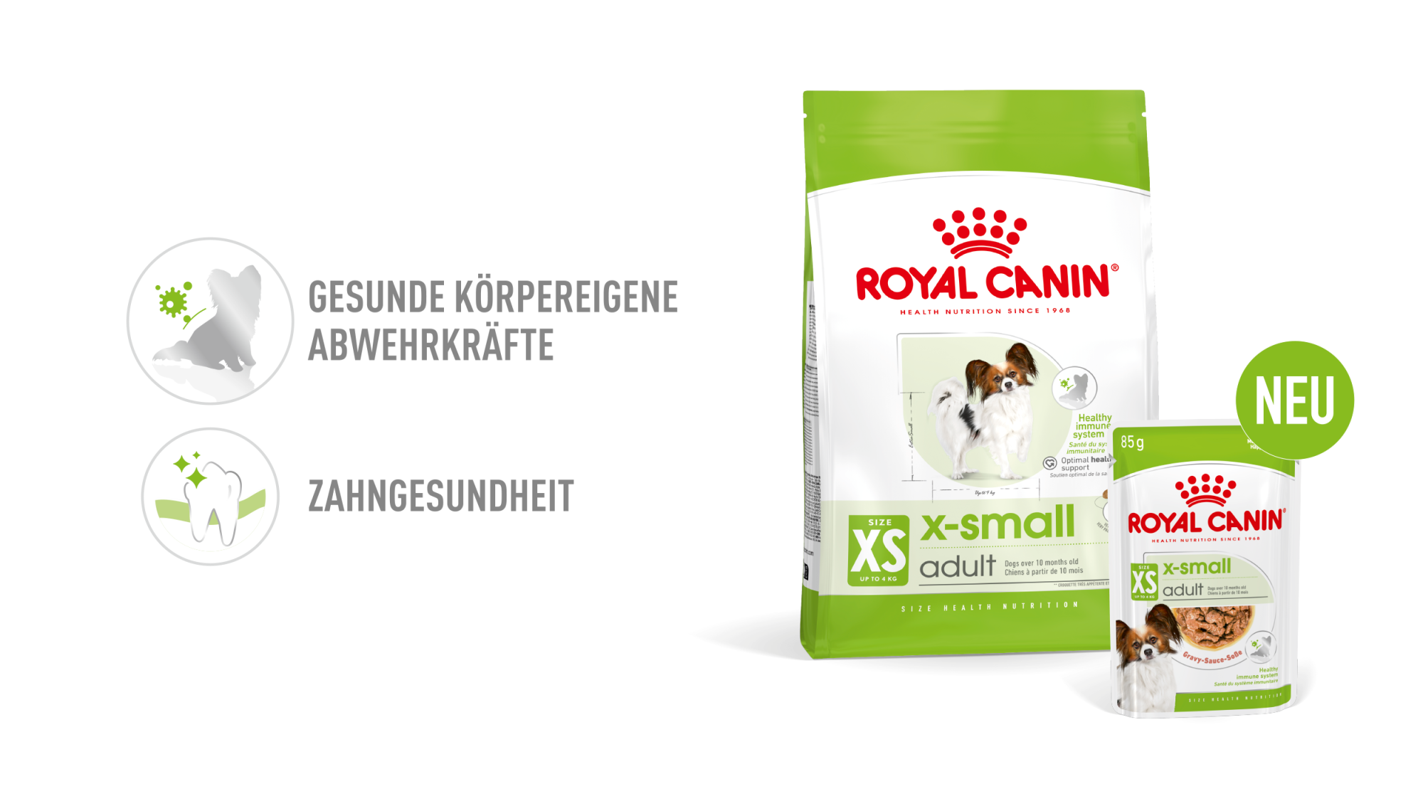 Jetzt neu: ROYAL CANIN® X-Small Adult und X-Small Puppy Häppchen in Soße! Diese ausgewogenen Feuchtnahrungen wurden speziell für die Bedürfnisse sehr kleiner Hunde bis 4 kg entwickelt. Die Rezeptur unterstützt die Gesundheit und Vitalität Ihres Vierbeiners mit essenziellen Nährstoffen wie EPA, DHA und Vitamin C. Die saftigen Fleischstücke in Soße bieten nicht nur ein besonderes Geschmackserlebnis, sondern fördern auch eine gesunde Haut und ein glänzendes Fell. Die neuen 85g Frischebeutel bieten eine leckere und leicht verdauliche Mahlzeit, die ideal als Alleinfuttermittel oder zur Mischfütterung mit Trockennahrung geeignet sind. X-Small Puppy ist für Hunde zwischen 2 und 10 Monaten geeignet und X -Small Adult für sehr kleine Hunde ab 10 Monaten.