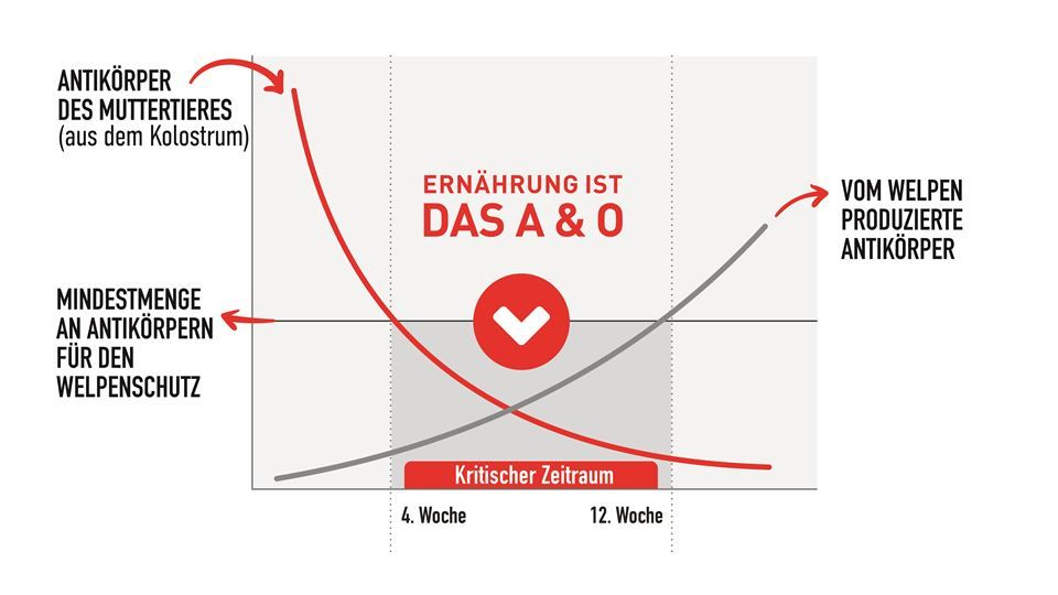 Welpen werden mit einem sehr unreifen bzw. (schwachen) Immunsystem geboren. Deshalb benötigen sie zum Überleben und um ihre natürlichen Abwehrkräfte zu stärken die Unterstützung einer hoch spezialisierten Art von Muttermilch. Diese einzigartige Milch, das sogenannte Kolostrum, wird in den ersten Wochen nach der Geburt der Welpen vom Körper der Mutter produziert. Sie enthält die Antikörper der Mutter und stärkt so das Immunsystem des gesamten Wurfs, wenn die Welpen langsam Kontakt mit ihrer Umwelt aufnehmen. Für den Fall, dass Welpen nicht von ihrer Mutter gesäugt werden können, gibt es Ersatzmilch mit einer Rezeptur, die der Milch der Hundemutter sehr nahekommt.