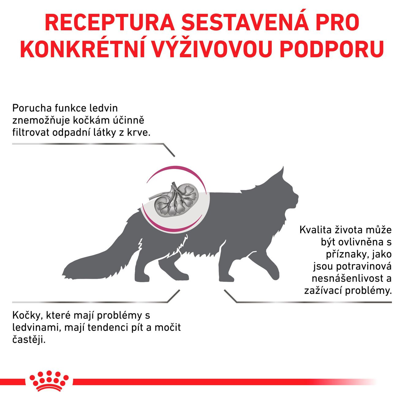 Složení s nízkým obsahem fosforu a středním obsahem bílkovin vysoké kvality pro podporu funkce ledvin, pomáhá zlepšit kvalitu života kočky.