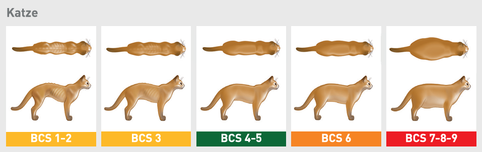 Um das ideale Körpergewicht Ihrer Katze besser einschätzen zu können, gibt es eine hilfreiche Methode: den Body Condition Score (BCS). Hierfür betrachten Sie Ihre Katze gründlich von allen Seiten und tasten den Körper ordentlich ab. Anschließend bewerten Sie den Zustand Ihres Tieres auf einer Skala von 1 bis 9. Von 1 für unterernährt oder abgemagert bis 9 für fettleibig gibt es verschiedene Unterteilungen. Der gesunde Bereich für Ihren Stubentiger liegt zwischen 4 und 5.