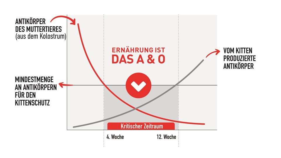 Weil der Schutz, den Ihr Kätzchen durch die Muttermilch erhält, nicht für immer anhält. Er funktioniert nur vorübergehend, denn er ermöglicht dem Jungtier zwar einen guten Start ins Leben, lässt aber nach etwa 5 bis 6 Wochen allmählich nach. Die erste Impfung Ihres Kätzchens schützt es auf seinem Lebensweg gegen die gefährlichsten Krankheiten (wie Panleukopenie und Katzenschnupfen). Aber sein Körper ist erst mit etwa 2 Monaten in der Lage, auf die Impfstoffe zu reagieren. Somit entsteht eine Zeit, die „Immunologische Lücke“ genannt wird. In dieser Phase hat ein Kätzchen einen großen Teil des Schutzes durch die Muttermilch verloren, aber fast noch keine eigenen Abwehrkräfte aufgebaut.