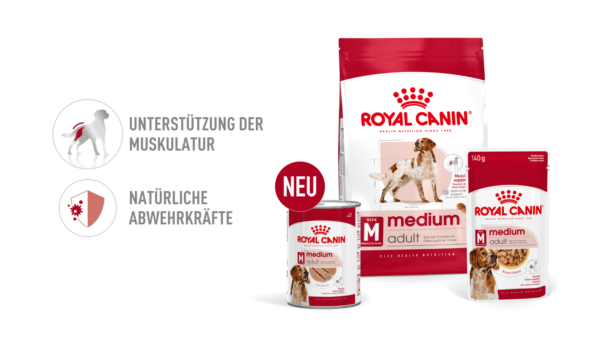 Mittelgroße Hunde stecken voller Energie. Aber damit sie ihre hohe Bewegungsintensität aufrechterhalten können, benötigen sie starke Muskeln. Unsere MEDIUM Nahrungen aus der ROYAL CANIN® Size Health Nutrition Produktreihe sind sorgfältig auf die besonderen Bedürfnisse mittelgroßer Hunde zugeschnitten.