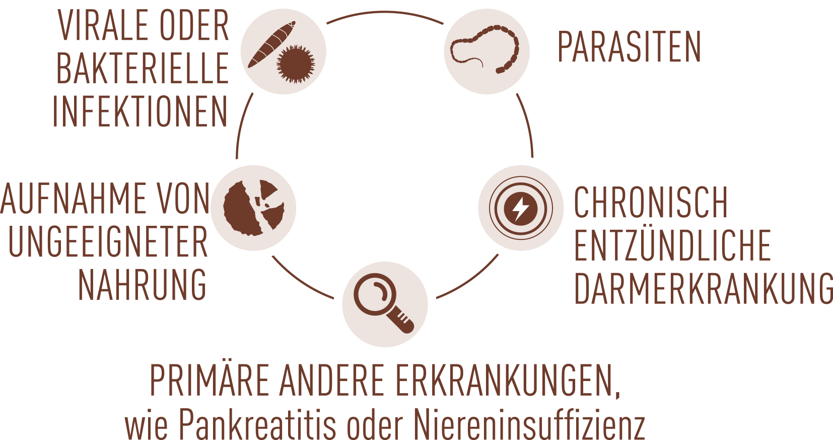Leidet Ihre Katze oder Ihr Hund an chronischen Verdauungsproblemen, ist das ein Fall für eine tierärztliche Behandlung. Fallen Ihnen über einen längeren Zeitraum eines oder mehrere der oben beschriebenen Symptome auf oder hat sich der Kot Ihres Tiers verändert, sollten Sie unbedingt ärztlichen Rat einholen. Da es viele mögliche Ursachen für Verdauungsprobleme gibt, ist die Diagnose nämlich oft schwierig zu stellen. Ursachen können sein: