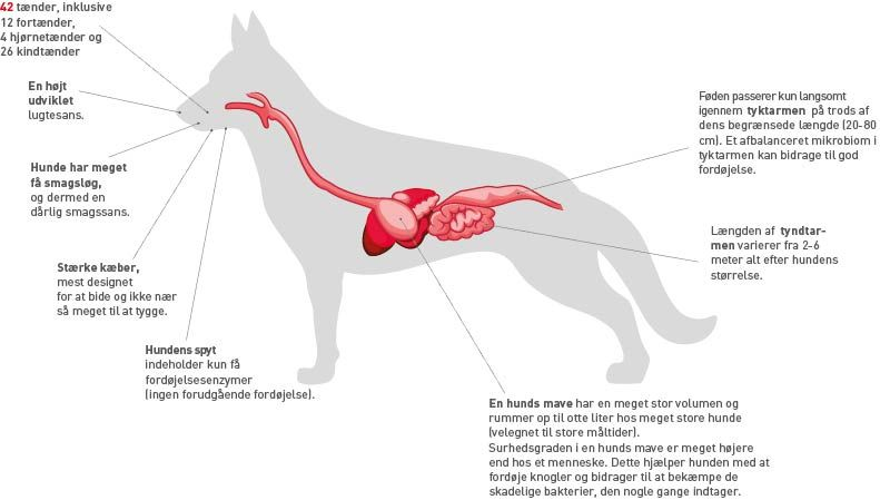 Hos hunde starter fordøjelsen i maven, hvor fordøjelsesenzymerne frigives, umiddelbart efter føden er slugt (hurtigt) og har passeret igennem spiserøret. Det kan godt være, at tyndtarmen bliver kaldt for tynd, men den har et stort overfladeareal, så næringsstofferne kan optages af kroppen. Til sidst transporteres tarmindholdet til tyktarmen, hvor mikrofloraen er placeret, før det, der er affald, føres til deres endelige destination – verdenen udenfor.