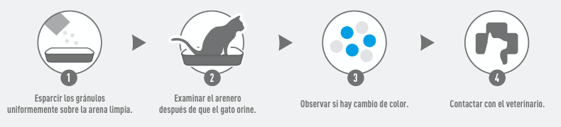 Cuando estos gránulos entran en contacto con la orina del gato, si ésta contiene hemoglobina, los gránulos pasan de ser blancos a adquirir un color azul oscuro, que indicarán al propietario que su gato está empezando a tener un problema urinario.