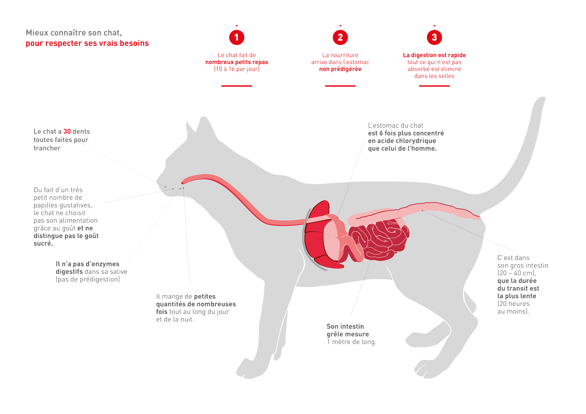 Il s'agit d'un processus scientifique et, pour qu'il fonctionne efficacement, l'aliment doit être hautement digestible afin que les chats puissent utiliser les nutriments vitaux dont ils ont besoin pour que leur croissance soit optimale. Un système digestif sain est également important pour éviter que les aliments non digérés ne fermentent ou ne se putréfient dans le gros intestin, perturbant ainsi la microflore délicate du chat (également appelée bactéries saines) et provoquant des problèmes digestifs tels que des diarrhées et des carences nutritionnelles qui peuvent ensuite se transformer en problèmes de santé à plus long terme.