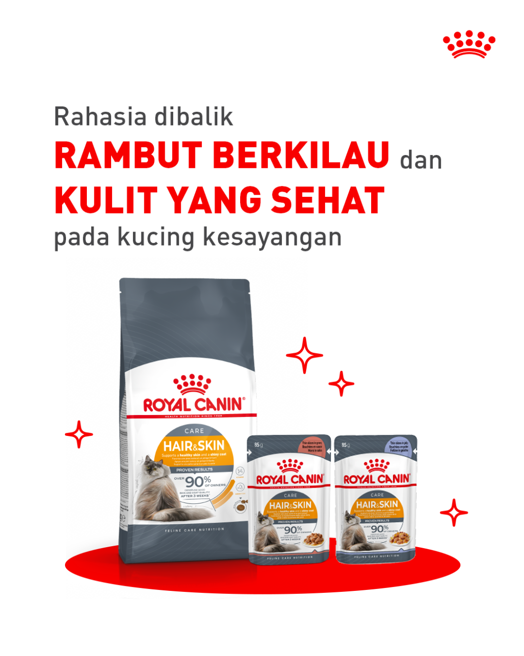 Royal Canin Hair & Skin Care diperkaya kombinasi asa lemak omega-3 dan omega-6 yang bermanfaat bagi kesehatan kulit dan keindahan rambut pada hewan kesayanganmu dalam waktu 3 minggu: