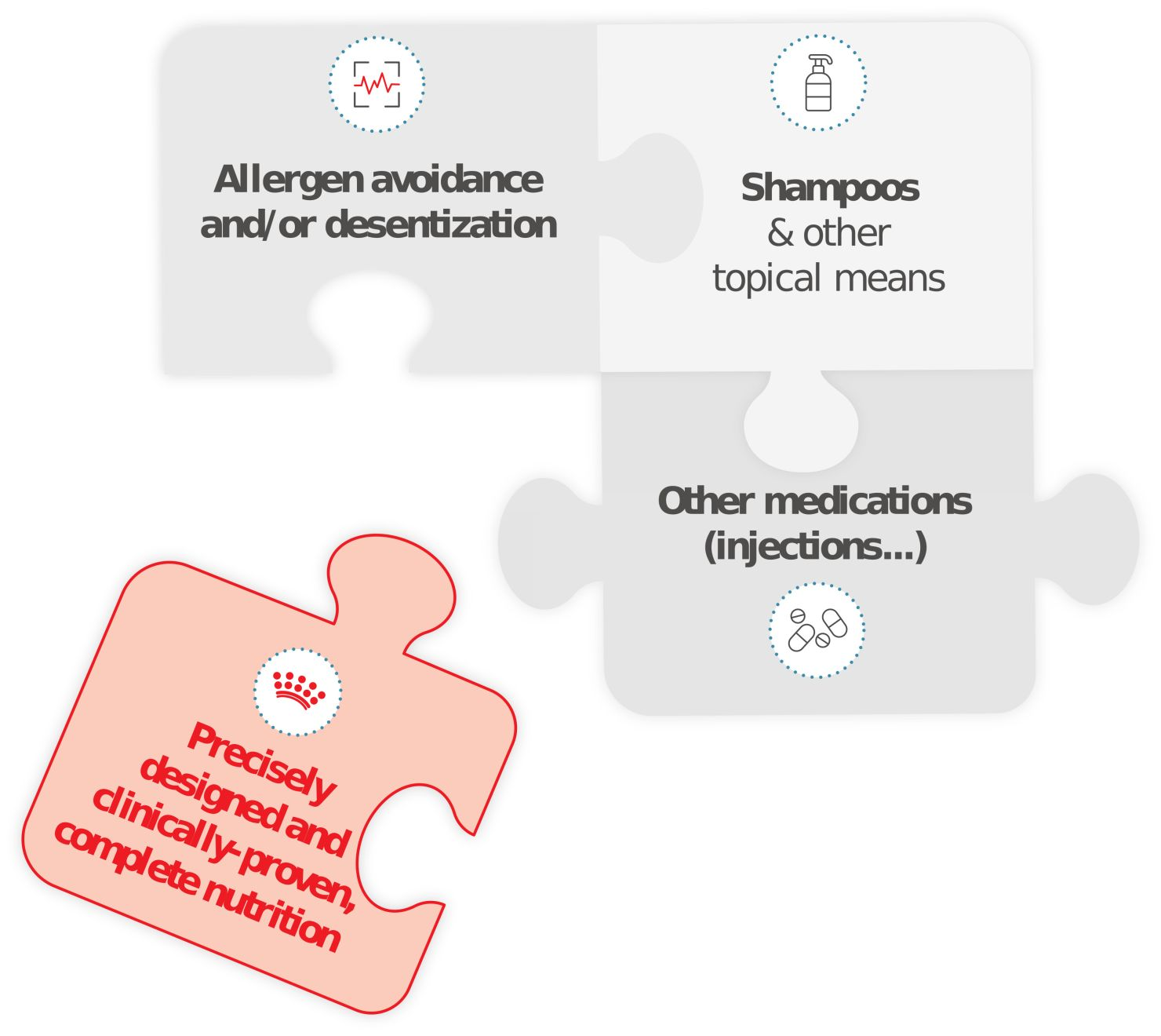 If your veterinarian has diagnosed atopic dermatitis, they will recommend a personalized management plan. Which may consist in a multi-modal approach, which will include nutritional support, is intended to optimize the management of canine atopic dermatitis by targeting a combination of diverse solutions to take into account all the important parts of the disease.