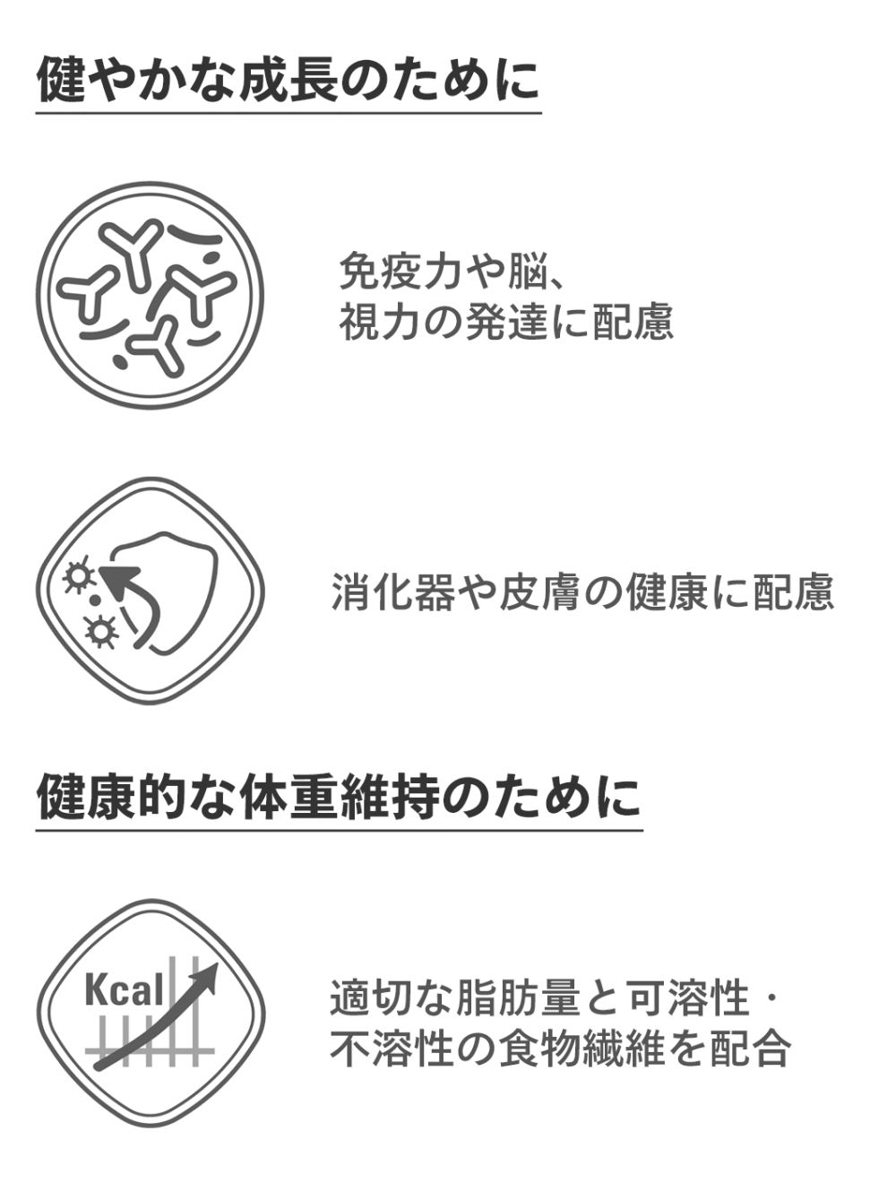 私たちの製品は、子猫の成長に合わせて設計されています。成長段階に合わせて特別に選ばれた栄養素により、発育を助け、健康的な生活の基礎を築くことができます。