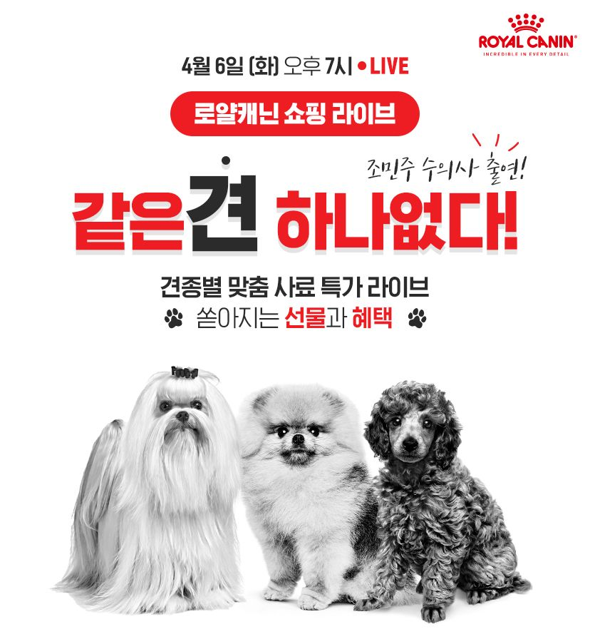 펫사료 브랜드 로얄캐닌(Royal Canin)이 6일 오후 7시에 첫 네이버 쇼핑 라이브 ‘견종별 맞춤 사료 특별전’을 선보인다.