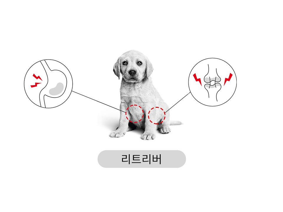 사료는 알갱이의 크기, 모양, 질감을 고려해 반려견에게 알맞게 급여해야 합니다. 성장기엔 에너지가 어느정도 필요한 건 사실이지만 과식할 경우 성장이 지나치게 빨리 진행될 수 있어 주의해야 합니다. 성장기 초기엔 근육보다 뼈를 중심으로 발달하기 때문에 래브라도 리트리버와 같이 성장 속도가 빠르고 성장기가 긴 대형견의 경우 사지 결손, 골격 기형, 관절 손상 등 뼈와 관절에 문제가 생기기 쉽습니다. 에너지 함량이 일정 수준으로 제한된 사료를 일일 권장량에 맞춰 급여한다면 성장 속도를 조절할 수 있어 이러한 질환을 예방할 수 있습니다. 중성화 수술을 했을 경우 체중이 더욱 빨리 증가할 수 있으니 특별히 유의해 주시길 바랍니다.