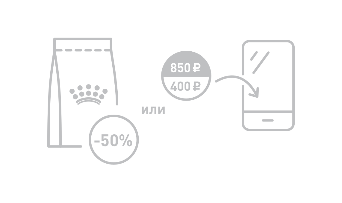 Выберите один из вариантов подарка: скидка 50% на покупку корма в магазинах-партнёрах или кэшбэк 400 или 850 рублей за покупку на мобильный телефон