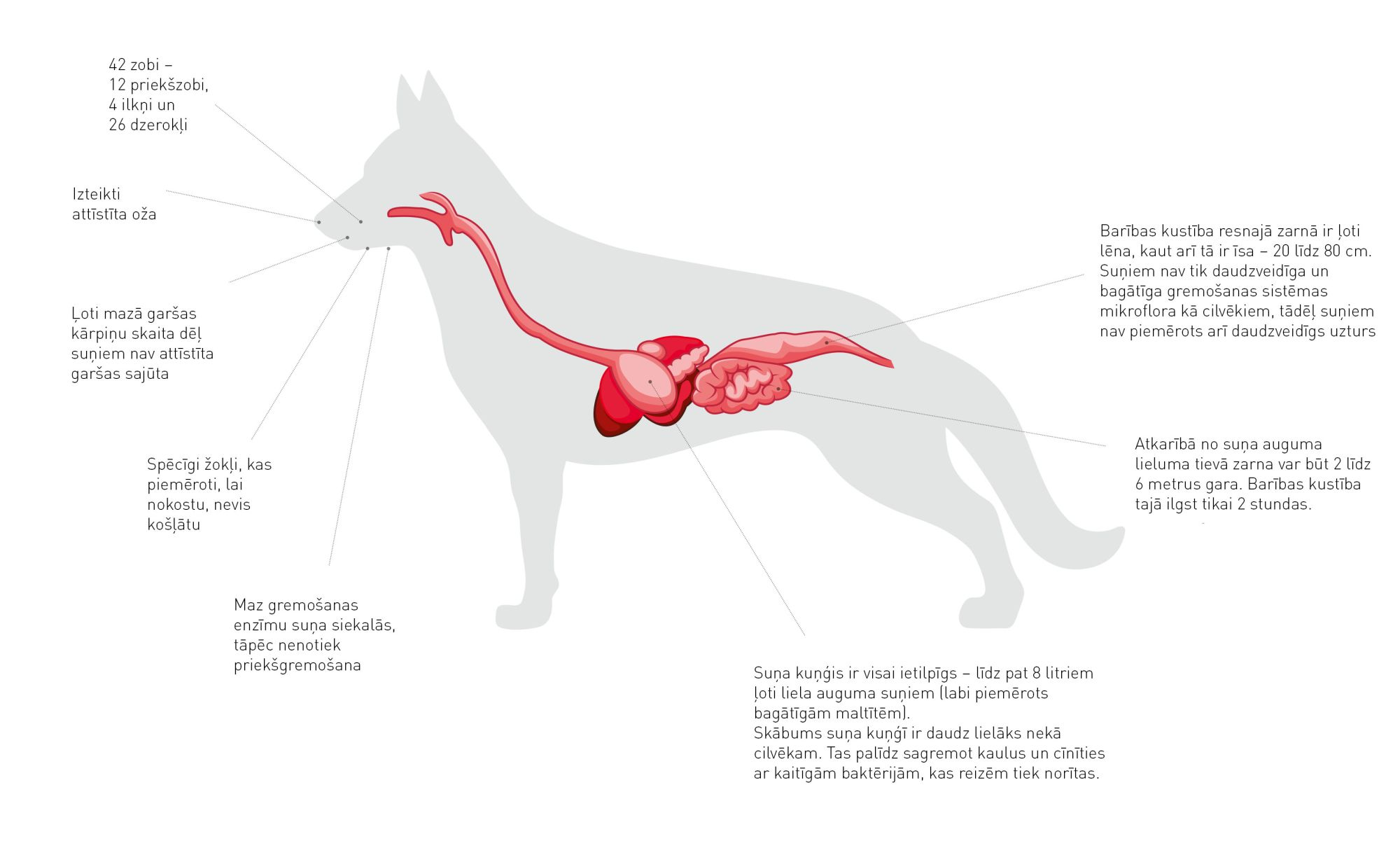 Suņiem gremošana sākas kuņģī – tajā, tiklīdz barība ir (strauji) norīta un izgājusi pa barības vadu, atbrīvojas gremošanas enzīmi. Lai gan tievās zarnas var saukt par tievām, tām ir liels virsmas laukums, kas ļauj uzturvielām uzsūkties organismā. Visbeidzot resnā zarna atkritumus nogādā galamērķī – atpakaļ pasaulē.