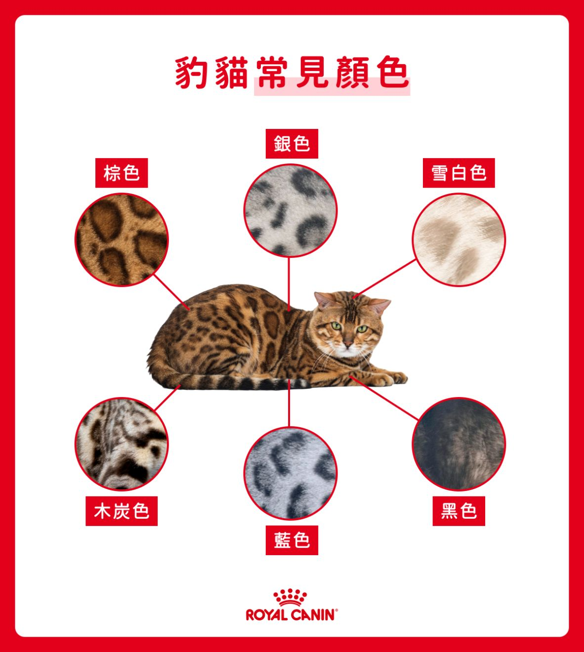 豹貓的毛色豐富,目前被國際貓協會(TICA)認可的顏色為棕色、銀色、雪白色,其中以棕色最為經典和廣為人知,而木炭色、藍色、黑色則為尚未被認可的顏色。