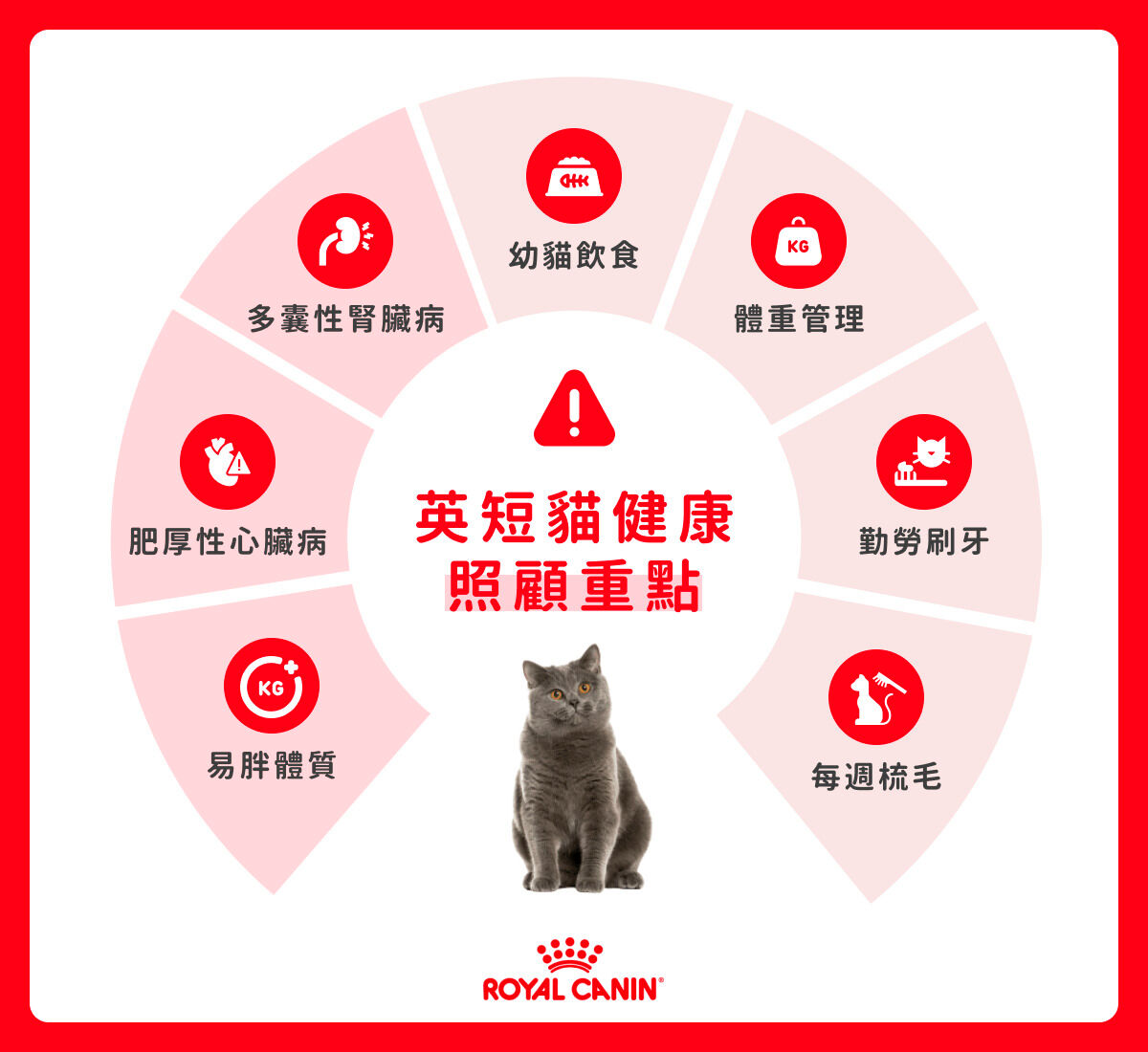 英國短毛貓因為遺傳因素,導致代謝能力較差,加上貓咪活動力不高,使得吃下去的卡路里難以消耗,這也使得每隻英短貓都是潛在的「小胖子」,貓咪肥胖除了會影響壽命外,也可能引發一系列的疾病,包含退化性關節炎、脂肪肝、糖尿病、尿路膀胱結石、癌症等。