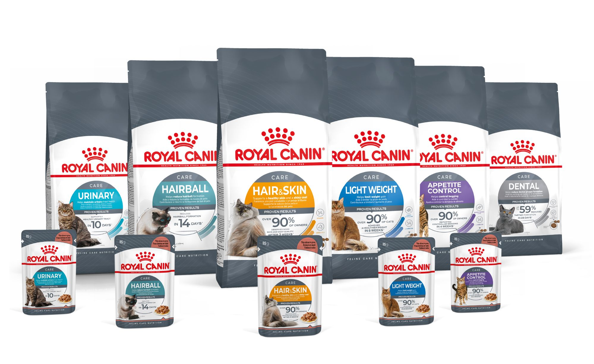 Раціони ROYAL CANIN® URINARY CARE доступні у вигляді сухого та вологого корму, розроблені для підтримання здоров'я сечовивідних шляхів.
